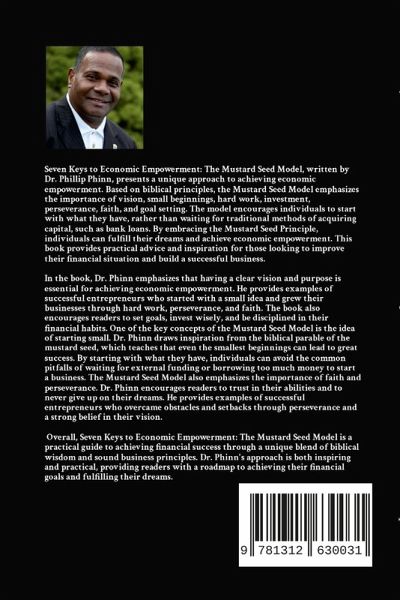 Seven Keys to Economic Empowerment: The Mustard Seed Model, written by Dr. Phillip Phinn, presents a unique approach to achieving economic empowerment. Based on biblical principles, the Mustard Seed Model emphasizes the importance of vision, small beginnings, hard work, investment, perseverance, faith, and goal setting. The model encourages individuals to start with what they have, rather than waiting for traditional methods of acquiring capital, such as bank loans. By embracing the Mustard Seed Principle, individuals can fulfill their dreams and achieve economic empowerment. This book provides practical advice and inspiration for those looking to improve their financial situation and build a successful business. In the book, Dr. Phinn emphasizes that having a clear vision and purpose is essential for achieving economic empowerment. He provides examples of successful entrepreneurs who started with a small idea and grew their businesses through hard work, perseverance, and faith. The book also encourages readers to set goals, invest wisely, and be disciplined in their financial habits. One of the key concepts of the Mustard Seed Model is the idea of starting small. Dr. Phinn draws inspiration from the biblical parable of the mustard seed, which teaches that even the smallest beginnings can lead to great success. By starting with what they have, individuals can avoid the common pitfalls of waiting for external funding or borrowing too much money to start a business. The Mustard Seed Model also emphasizes the importance of faith and perseverance. Dr. Phinn encourages readers to trust in their abilities and never give up on their dreams. He provides examples of successful entrepreneurs who overcame obstacles and setbacks through perseverance and a strong belief in their vision. Overall, Seven Keys to Economic Empowerment: The Mustard Seed Model is a practical guide to achieving financial success through a unique blend of biblical wisdom and sound business principles. Dr. Phinn's approach is both inspiring and practical, providing readers with a roadmap to achieving their financial goals and fulfilling their dreams.