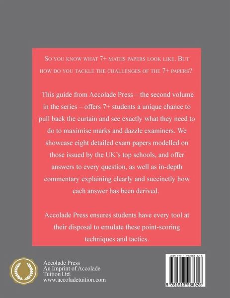 So you know what 7+ maths papers look like. But how do you tackle the unique challenges of the 7+ exams? This new guide from Accolade Press - the second volume in the series - offers 7+ students a unique chance to pull back the curtain and see exactly what they need to do to maximise marks and dazzle examiners. We showcase eight detailed exam papers modelled on those issued by the UK's top schools, and offer thorough answers to every question, as well as in-depth commentary explaining exactly how each answer has been derived. Accolade Press ensures students have every tool at their disposal to emulate these point-scoring techniques and tactics. ¿ Eight maths papers that mimic the length and difficulty of those issued by the UK's top private and grammar schools. Suitable for upcoming exams in 2022, 2023, 2024 and 2025. ¿ Papers split into separate formats so that students can familiarise themselves with the diverse styles of papers seen in the highly competitive 7+ field. ¿ Thorough answers for every question. ¿ In-depth explanations to accompany every model answer. These clearly and succinctly explain how each and every answer has been derived. ¿ Written by experienced tutor with a stellar track-record in 7+ admissions.