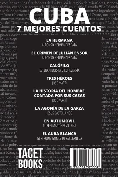 La colección 7 mejores cuentos - selección especial trae lo mejor de la literatura mundial, organizada en antologías temáticas. En este volumen te traemos grandes nombres de la vibrante literatura cubana: La hermana por Alfonso Hernández Catá; El crimen de Julián Ensor por Alfonso Hernández Catá; Calófilo por Esteban Borrero Echeverría; Tres héroes por José Martí; La historia del hombre contada por sus casas por José Martí; La agonía de La Garza por Jesús Castellanos; En Automóvil por Rubén Martínez Villena; El aura blanca por Gertrudis Gómez de Avellaneda. Echeverría, Esteban Borrero (Autor) - Catá, Alfonso Hernández (Autor) - Nemo, August (Editor)