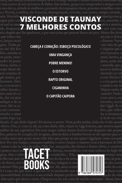 Na coleção 7 melhores contos, o crítico August Nemo apresenta autores que fazem parte da história da literatura em língua portuguesa. Neste volume temos Visconde de Taunay, um dos fundadores da Academia Brasileira de Letras. Sua obra foi reconhecida e elogiada não apenas no Brasil, como também na crítica especializada francesa e inglesa do século XIX. Os contos presentes nessa obra são: - Cabeça e coração: esboço psicológico: um diálogo introspectivo entre um homem mais velho e uma jovem explora as diferenças de idade e as complexidades das emoções humanas. - Uma vingança: em um baile, um homem busca um confronto final, revelando tensões e segredos em um ambiente carregado de ressentimento e emoção. - Pobre menino!: uma reflexão tocante sobre a fragilidade da vida, observada através dos olhos de um menino doente e sua família em uma viagem de trem. - O estorvo: Amaro Esteves enfrenta as reviravoltas da sorte e os desafios da convivência com uma esposa que considera um estorvo, explorando as dinâmicas do casamento. - Rapto original: um romance intenso e turbulento entre vizinhos captura a atenção da comunidade, levando a eventos inesperados e dramáticos. - Ciganinha: a história de uma jovem de espírito livre, e suas interações com a comunidade, cheia de promessas e perigos. - O capitão caipora: a trajetória de um capitão, marcado por sua honestidade e simplicidade, enfrenta desafios na busca por reconhecimento e promoção. Se você gosta de boa literatura, confira os outros livros da Coleção 7 melhores contos. Boa leitura!