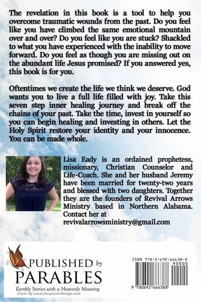 The revelation in this book is a tool to help you overcome traumatic wounds from the past. Do you feel like you have climbed the same emotional mountain over and over? Do you feel like you are stuck?Shackled to what you have experienced with the inability to move forward. Do you feel as though you are missing out on the abundant life Jesus promised? If you answered yes, this book is for you. Oftentimes we create the life we think we deserve. God wants you to live a full life filled with joy. Take this seven step inner healing journey and break off the chains of your past. Take the time, invest in yourself so you can begin healing and investing in others. Let the Holy Spirit restore your identity and your innocence. You can be made whole. Lisa Eady is an ordained prophetess, missionary, Christian Counselor and Life-Coach. She and her husband Jeremy have been married for twenty-two years and blessed with two daughters. Together they are the founders of Revival Arrows Ministry based in Northern Alabama. Contact her at revivalarrowsministry@gmail.com