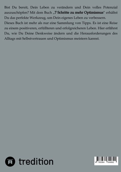 Bist Du bereit, Dein Leben zu verändern und Dein volles Potenzial auszuschöpfen? Mit dem Buch "7 Schritte zu mehr Optimismus" erhältst Du das perfekte Werkzeug, um Dein eigenes Leben zu verbessern. Dieses Buch ist mehr als nur eine Sammlung von Tipps. Es ist eine Reise zu einem positiveren, erfüllteren und erfolgreicheren Leben. Hier erfährst Du, wie Du Deine Denkweise ändern und die Herausforderungen des Alltags mit Selbstvertrauen und Optimismus meistern kannst.