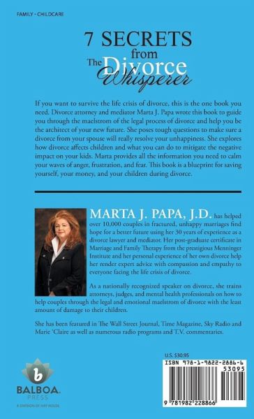 If you want to survive the life crisis of divorce, this is the one book you need. Divorce attorney and mediator Marta J. Papa wrote this book to guide you through the maelstrom of the legal process of divorce and help you be the architect of your new future. She poses tough questions to make sure a divorce from your spouse will really resolve your unhappiness. She explores how divorce affects children and what you can do to mitigate the negative impact on your kids. Marta provides all the information you need to calm your waves of anger, frustration, and fear. This book is a blueprint for saving yourself, your money, and your children during divorce.