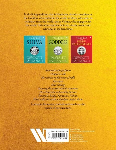 About the Book EXAMINING THE DIFFERENT MYTHS AND RITUALS ABOUT LORD VISHNU AND HIS AVATARS, THIS BOOK UNCOVERS THE ANCIENT WISDOM INHERITED OVER GENERATIONS WHICH STILL HOLD RELEVANCE TODAY. For Hindus, Vishnu is God who inspires man to discover humanity by engaging with the world. Artists have visualized him with as curly-haired, dark complexioned man with a smile on his lips and a sparkle in his eyes. Draped in yellow silk, garlanded with forest flowers, bedecked with dolphin-shaped earrings, anointed with sandal paste, he reclines on a thousand-hooded serpent that floats on the ocean of milk and rides a golden hawk bearing in his arms a conch-shell, a wheel, a mace and a lotus. Poets say that when he is awake, the world takes shape; when he is asleep, the world ceases to be. Lakshmi, the goddess of wealth, follows him wherever he goes. To him is made offerings of rich creamy butter. Sometimes, the upright Ram, he is worshipped across India as Balaji, Shreenathji, Jagannath, Ranganath and Badrinath. Locked in the stories, symbols and rituals of Vishnu is the wisdom of the ancestors, transmitted over hundreds of years. This book attempts to unlock seven secrets that are relevant even in modern times. About the Author Devdutt Pattanaik is an Indian physician turned leadership consultant, mythologist and author whose works focus largely on the areas of myth, mythology and also management. He is former chief belief officer of Future Group, one of India's largest retailers. He writes a column for the newspaper Mid-Day.