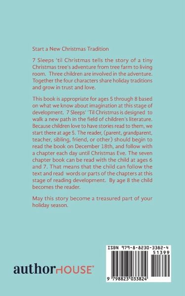 Start a New Christmas Tradition 7 Sleeps 'til Christmas tells the story of a tiny Christmas tree's adventure from tree farm to living room. Three children are involved in the adventure. Together the four characters share holiday traditions and grow in trust and love. This book is appropriate for ages 5 through 8 based on what we know about imagination at this stage of development. 7 Sleeps' 'Til Christmas is designed to walk a new path in the field of children's literature. Because children love to have stories read to them, we start there at age 5. The reader, (parent, grandparent, teacher, sibling, friend, or other) should begin to read the book on December 18th, and follow with a chapter each day until Christmas Eve. The seven chapter book can be read with the child at ages 6 and 7. That means that the child can follow the text and read words or parts of the chapters at this stage of reading development. By age 8 the child becomes the reader. May this story become a treasured part of your holiday season.