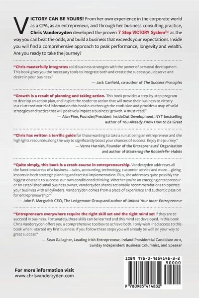 If you have ever considered taking control of your financial future through entrepreneurship, now is the time. And if you already own your own business, it's time to take your organization to the next level. From her own experience in the corporate world as a CPA, as an entrepreneur, and through her business consulting practice, Chris Vanderzyden developed the 7 Step VICTORY system as the way you can beat the odds, and build a business that exceeds your expectations. In just 7 Steps, you will discover a systematic process to launching a new business - or elevating an existing one. Inside you will find a comprehensive approach to peak performance, longevity and wealth. Are you ready to take the journey? The Harvard Business School estimates that 75% of businesses fail within the first five years. Is your business inside - or outside - that number? Chris Vanderzyden has studied statistics so that you can defy them. This book will show you that everyone can be successful given the right tools, knowledge, fortitude, and through taking continuous action. Leverage the economic conditions, take action and - in 7 steps - lead your business to victory. Now is the time to create the business and life you desire and deserve.