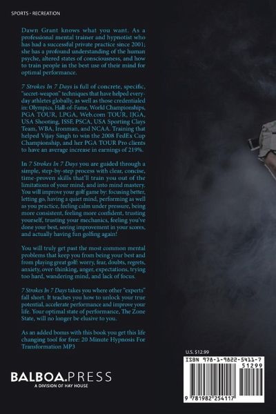 Dawn Grant knows what you want. As a professional mental trainer and hypnotist who has had a successful private practice since 2001; she has a profound understanding of the human psyche, altered states of consciousness, and how to train people in the best use of their mind for optimal performance. 7 Strokes In 7 Days is full of concrete, specific, "secret-weapon" techniques that have helped every-day athletes globally, as well as those credentialed in: Olympics, Hall-of-Fame, World Championships, PGA TOUR, LPGA, Web.com TOUR, IJGA, USA Shooting, ISSF, PSCA, USA Sporting Clays Team, WBA, Ironman, and NCAA. Training that helped Vijay Singh to win the 2008 FedEx Cup Championship, and her PGA TOUR Pro clients to have an average increase in earnings of 219%. In 7 Strokes In 7 Days you are guided through a simple, step-by-step process with clear, concise, time-proven skills that'll train you out of the limitations of your mind, and into mind mastery. You will improve your golf game by: focusing better, letting go, having a quiet mind, performing as well as you practice, feeling calm under pressure, being more consistent, feeling more confident, trusting yourself, trusting your mechanics, feeling you've done your best, seeing improvement in your scores, and actually having fun golfing again! You will truly get past the most common mental problems that keep you from being your best and from playing great golf: worry, fear, doubts, regrets, anxiety, over-thinking, anger, expectations, trying too hard, wandering mind, and lack of focus. 7 Strokes In 7 Days takes you where other "experts" fall short. It teaches you how to unlock your true potential, accelerate performance and improve your life. Your optimal state of performance, The Zone State, will no longer be elusive to you. As an added bonus with this book you get this life changing tool for free: 20 Minute Hypnosis For Transformation MP3
