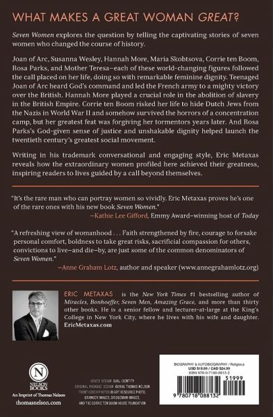 NEW YORK TIMES BESTSELLER Be inspired as you explore the captivating stories of seven Christian women of faith who changed the course of history. New York Times bestselling author Eric Metaxas gives you seven fascinating portraits of some of the greatest women who ever lived, each of whom changed the course of history by following God;s call upon their lives. Each of the world-changing figures who stride across these pages--Joan of Arc, Susanna Wesley, Hannah More, Sister Maria of Paris, Corrie ten Boom, Rosa Parks, and Mother Teresa--is an exemplary model of true womanhood. Learn integrity and courage from the stories of heroines like: * Teenaged Joan of Arc, who followed God's call and liberated her country, dying a heroic martyr's death * Susanna Wesley, who had nineteen children and gave the world its most significant evangelist and its greatest hymn writer, her sons John and Charles * Corrie ten Boom, who was arrested for hiding Dutch Jews from the Nazis and survived the horrors of a concentration camp, astonishing the world by forgiving her tormentors * Rosa Parks, whose deep sense of justice and unshakable dignity and faith helped launch the twentieth century's greatest social movement Writing in his trademark conversational and engaging style, Eric Metaxas reveals how the extraordinary women profiled here achieved their greatness, inspiring readers to lives guided by a call beyond themselves.