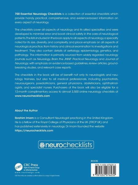 These 700 essential neurology checklists have been developed to assist in minimising error and boosting clinical safety in the care of neurological patients. They apply to all aspects of neurology, a specialty noted for its size, diversity, and complexity.Appropriate not just to neurologists but to all medical professionals.