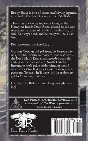 Bobby Hank is one of yesteryear's living legends, an autoduellist once known as the Pale Rider. These days he's scraping out a living in the Hampton Roads Dead Zone, chased by old age, regret, and a cannibal horde. If he slips up, his wife Kat stays dead, and he really will be a has-been. But opportunity is knocking . . . Gordon Cory, an old pal from his bygone days of glory, has Bobby in mind for one last ride - the Dead Man's Run, a nationwide road rally ending in the badlands of North Dakota. Enormous cash prize aside, winning would mean a spot for Kat in a Herolutions research program. To start, he'll have just three days to get to Memphis, Tennessee. Can the Pale Rider survive long enough to win big?