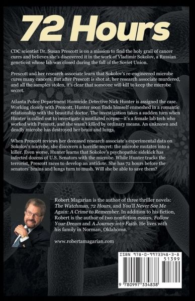 CDC scientist Dr. Susan Prescott is on a mission to find the holy grail of cancer cures and believes she's discovered it in the work of Vladimir Sokolov, a Russian geneticist whose lab was closed during the fall of the Soviet Union. Prescott and her research associate learn that Sokolov's re-engineered microbe cures many cancers. But after Prescott is shot at, her research associate murdered, and all the samples stolen, it's clear that someone will kill to keep the microbe secret. Atlanta Police Department Homicide Detective Nick Hunter is assigned the case. Working closely with Prescott, Hunter soon finds himself enmeshed in a romantic relationship with the beautiful doctor. The investigation takes a sudden turn when Hunter is called out to investigate a mutilated corpse--it's a female lab tech who worked with Prescott, and she wasn't killed by ordinary means. An unknown and deadly microbe has destroyed her brain and lungs. When Prescott reviews her deceased research associate's experimental data on Sokolov's microbe, she discovers a horrific secret: the microbe mutates into a killer. Even worse, Hunter learns that Sokolov's psychopathic sidekick has infected dozens of U.S. Senators with the microbe. While Hunter tracks the terrorist, Prescott races to develop an antidote. She has 72 hours before the senators' brains and lungs turn to mush. Will she be able to save them?