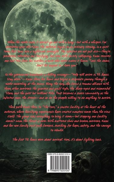 When the world ends, it doesn't go out with a bang-but with a whisper. For seventeen-year-old Kasai, the outbreak begins on an ordinary evening, in a quiet town that turns into a nightmare overnight. The infected are not just sick-they're predators, relentless and terrifying. And now, with society collapsing, Kasai receives one last text from her mother, a nurse who never makes it home: "Lock the doors. Don't let anyone in. I love you." As the government broadcasts a chilling message-"Help will arrive in 72 hours. Stay alive."-Kasai flees her home and begins a desperate journey through a world unraveling at the seams. Along the way, she forms a tenuous alliance with three other survivors: the guarded and gruff Kyle, the sharp-eyed and resourceful Elara, and the quiet but brilliant Milo. Trust becomes a scarce commodity as the infected roam the streets-and so do the people willing to do anything to survive. Their path leads them to "The Core," a sinister facility at the heart of the outbreak, where horrifying experiments have created monsters worse than the virus itself. The group risks everything to bring it down-but stopping one facility doesn't mean the threat is over. With scattered clues and broken survivors, Kasai and her new family must push forward, searching for hope, safety, and the courage to rebuild. The first 72 hours were about survival. Now, it's about fighting back.