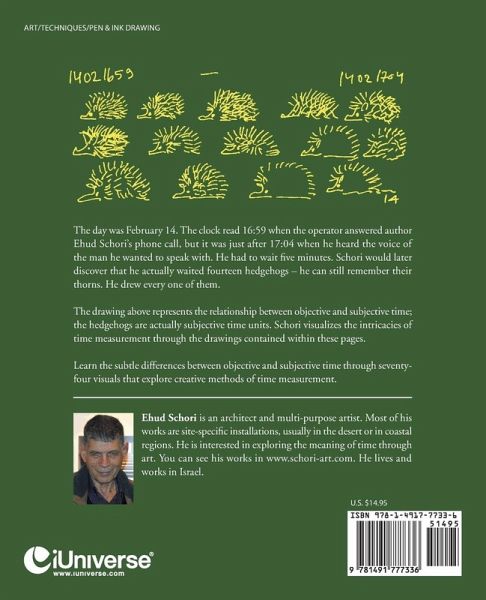 The day was February 14. The clock read 16:59 when the operator answered author Ehud Schori's phone call, but it was just after 17:04 when he heard the voice of the man he wanted to speak with. He had to wait five minutes. Schori would later discover that he actually waited fourteen hedgehogs - he can still remember their thorns. He drew every one of them. The drawing above represents the relationship between objective and subjective time; the hedgehogs are actually subjective time units. Schori visualizes the intricacies of time measurement through the drawings contained within these pages. Learn the subtle differences between objective and subjective time through seventy-four visuals that explore creative methods of time measurement.
