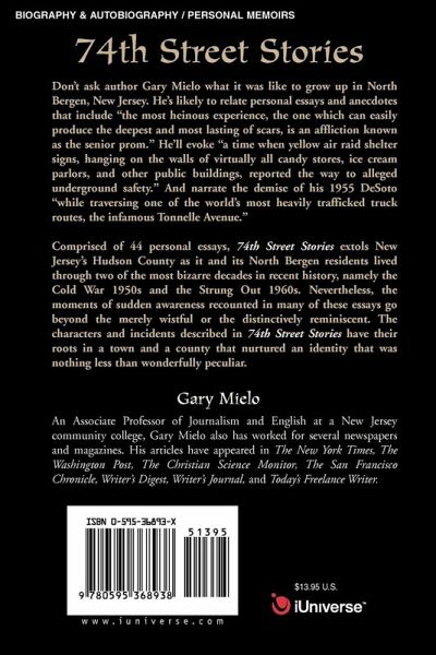 Don't ask author Gary Mielo what it was like to grow up in North Bergen, New Jersey. He's likely to relate personal essays and anecdotes that include 'the most heinous experience, the one which can easily produce the deepest and most lasting of scars, is an affliction known as the senior prom". He'll evoke 'a time when yellow air raid shelter signs, hanging on the walls of virtually all candy stores, ice cream parlors, and other public buildings, reported the way to alleged underground safety". And narrate the demise of his 1955 DeSoto 'while traversing one of the world's most heavily trafficked truck routes, the infamous Tonnelle Avenue". Comprised of 44 personal essays, 74th Street Stories extols New Jersey's Hudson County as it and its North Bergen residents lived through two of the most bizarre decades in recent history, namely the Cold War 1950s and the Strung Out 1960s. Nevertheless, the moments of sudden awareness recounted in many of these essays go beyond the merely wistful or the distinctively reminiscent. The characters and incidents described in 74th Street Stories have their roots in a town and a county that nurtured an identity that was nothing less than wonderfully peculiar.