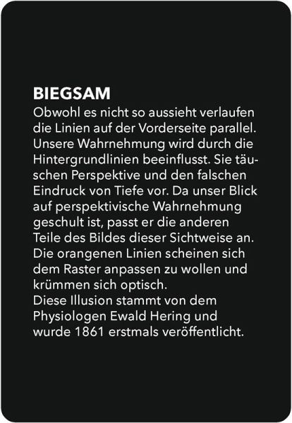 Achtung, garantierter Augenschwindel! Manchmal wirkt auf ersten Blick nicht alles so, wie es wirklich ist. Schau noch ein zweites Mal hin und lasse deine Sinne durch Anamorphosen, Ambigramme, Op Art, Schattenspiele, 3D-Effekte, subjektive Farben, Bewegungs- Illusionen, Such- und Vexierbilder und noch vieles mehr durcheinanderbringen. 75 faszinierende optische Illusionen auf Karten verführen zu täuschend echten Wahrnehmungen und fantastischen Sinnestäuschungen. Irren ist erlaubt und sogar erwünscht!+ 75 Karten mit optischen Illusionen und Sinnestäuschungen+ Box in cooler Neon-Optik