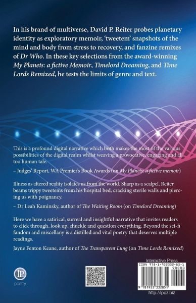 In his brand of multiverse, David P. Reiter probes planetary identity as exploratory memoir, 'tweetem' snapshots of the mind and body from stress to recovery, and fanzine remixes of Dr Who. In these key selections from the award-winning My Planets: a fictive Memoir, Timelord Dreaming, and Time Lords Remixed he tests the limits of genre and text. My Planets: a fictive memoir won the Western Australian Premier's Award in 2012. Timelord Dreaming: tweetems from ward 8b won the 2016 Western Australian Premier's Award.