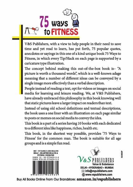 V&S Publishers, with a view to help people in their need to save time and yet read to learn, has put forth, 75 popular quotes, anecdotes or sayings in this one of a kind unique book 75 Ways to Fitness, in which every Tip/Hack on each page is supported by a caricature type illustration. The concept behind making this out-of-the-box book is- "A picture is worth a thousand words", which is a well-known adage meaning that a number of different ideas can be conveyed by a single image more effectively than a verbal description. People instead of reading a text, opt for videos or images on social media for learning and leisure reading. We, at V&S Publishers, have already embraced this philosophy in this book knowing well that static pictures leave a larger impact on readers than text. Instead of using old school definitions and textual descriptions, the book uses a one liner with an illustration on each page similar to posts or memes on social media to convey the idea. This book is a part of a series having 10 books with each dedicated to a different idea like happiness, riches, health etc. This book, in the shortest way possible, provides '75 Ways to Fitness' for the common man. The book is suitable for all age groups and is a simple fun read.