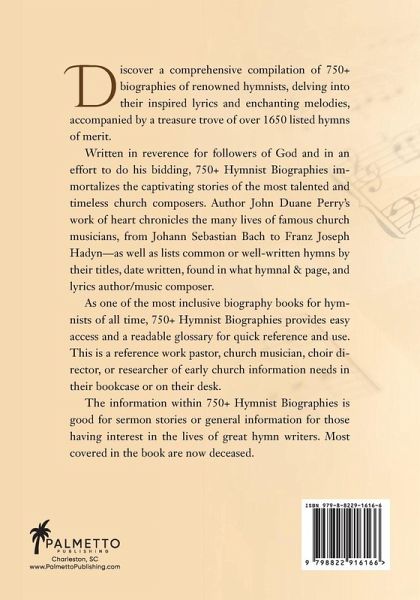 Discover a comprehensive compilation of 750+ biographies of renowned hymnists, delving into the brilliant minds behind their inspiring lyrics and enchanting melodies, accompanied by a treasure trove of over 1650 listed hymns of merit. Based on passion and in researched facts, author John Duane Perry's work of heart, 750+ Hymnist Biographies, chronicles the lives of many famous church musicians, pastors, and church leaders, such as Johann Sebastian Bach, Franz Joseph Hadyen, and many more. It also lists many common, but obscure well-written hymns, including:Titles Date written Found in what hymnal & page Lyrics author/music composer Written in reverence for followers of God and in an effort to do his bidding, 750+ Hymnist Biographies immortalizes the captivating stories of the many talented and timeless church composers. The information within 750+ Hymnist Biographies is good for sermon stories or general information for those having interest in the lives of our great hymn writers, as most covered in the book now being deceased. This is a reference work pastor, church musician, choir director, or researcher of early church information needs in their bookcase or on their desk. As one of the most inclusive biography books for hymnists of all time, 750+ Hymnist Biographies provides easy access and a readable glossary for quick reference and use.