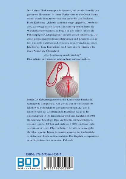 Nach einer Flutkatastrophe in Spanien, bei der die Familie den gesamten Hausstand in ihrem Ferienhaus an der Costa Blanca verlor, wurde dem Autor von einer Freundin das Buch von Hape Kerkeling "Ich bin dann mal weg" gegeben. Damit trat der Jakobsweg in sein Leben. Eine Knieoperation hatte die Wanderkarriere beendet, so begab er sich mit 69 Jahren als Fahrradpilger Cicloperegrino auf den ersten Jakobsweg. Die dabei gemachten positiven Erfahrungen und Erkenntnisse ließen ihn nicht mehr los und er musste immer wieder auf einen Jakobsweg. Eine Journalistin hatte nach einem Interview für ihren Artikel die Überschrift "Der Jakobsweg macht süchtig" gefunden. Dies scheint den Zustand sehr treffend zu beschreiben. Seinen 75. Geburtstag feierte er im Kreis seiner Familie in Santiago de Compostela. Am Vortag war er von von seinem 10. Jakobsweg wohlbehalten dort angekommen. Auf den 10 Jakobswegegen auf der Iberischen Halbinsel hat er in 101 Tagesetappen 10.157 km zurückgelegt und hat dabei 106.095 Höhenmeter bewältigt. Dies ergibt eine mittlere Etappenleistung von gut 100 km bei mehr als 1.000 Hm. Dass Cicloperegrinos in vielen Pilgerherbergen bei der Bettenvergabe als Pilger zweiter Klasse behandelt werden, hat ihn bestärkt, in einfachen Hotels zu übernachten. Das Gepäck transportierte er in Gepäcktaschen an seinem Fahrrrad.