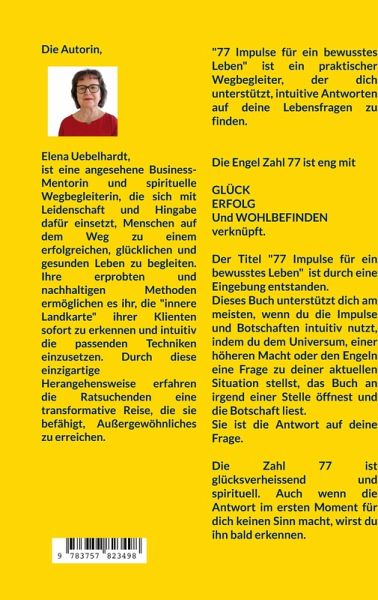 "77 Impulse für ein bewusstes Leben" ist ein praktischer Wegbegleiter, der dich unterstützt, intuitive Antworten auf deine Lebensfragen zu finden. Die Engel Zahl 77 ist eng verknüpft mit GLÜCK, ERFOLG und WOHLBEFINDEN Der Titel "77 Impulse für ein bewusstes Leben" ist durch eine Eingebung entstanden. Dieses Buch unterstützt dich am meisten, wenn du die Impulse und Botschaften intuitiv nutzt, indem du dem Universum, einer höheren Macht oder den Engeln eine Frage zu deiner aktuellen Situation stellst, das Buch an irgend einer Stelle öffnest und die Botschaft liest. Sie ist die Antwort auf deine Frage.Die Zahl 77 ist glücksverheissend und spirituell. Auch wenn die Antwort im ersten Moment für dich keinen Sinn macht, wirst du ihn bald erkennen.