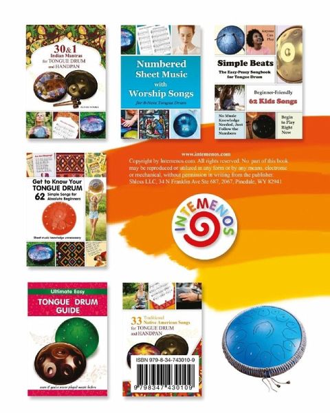 The book features 77 songs, all of which can be played on any C-major tongue drum with 13 or more keys. Most of the songs can also be played on an 11-key tongue drum. All melodies are written in traditional musical notation, but this book is beginner-friendly as well. For those unfamiliar with reading sheet music, we've added corresponding numbers above each note. Each page includes QR codes that link to recordings of the songs. Contents Alabama Gal Annie Laurie Aura Lee Barbara Polka Bayou Sara Beautiful Brown Eyes Bella Ciao Big Rock Candy Mountains Blood on the Saddle Bound for South Australia Brennan on the Moor Bridal Chorus Bury Me Not on the Lone Prairie Butcher Boy Cliffs of Doneen Come Back Liza Cotton Eyed Joe Daddy Fox Down by the Salley Gardens Drink to Me Only With Thine Eyes Drunken Sailor Fire In the Mountains For He Is a Jolly Good Fellow Get Along Little Doggies Henry My Son Hi'ilawe Hopping Dance Isn't It Grand, Boys? Italian Waltz James Connoly Land of the Silver Birch Largo from New World Symphony by Dvorak Lavender's Blue Long, Long Ago Man of Constant Sorrow Molly Malone My Bonnie Lies Over the Ocean My Home's in Montana My Paddle My Singing Bird My Wild Irish Rose O Christmas Tree Oh Dear What Can the Matter Be Oh How Lovely the Evening Is Old Folks at Home Old Jim Slack Grey Horse Peace Round Pigeon on the Gate Scarborough Fair She Wore a Yellow Ribbon She'll Be Coming Round the Mountain Skibbereen Spancil Hill Sweet Betsy From Pike The Banks of Claudy The Bonny Boy The Boys of Fairhill The Curragh of Kildare The Galway Races The Irish Rover The Kerry Recruit The Meeting of the Waters The Northern Lights of Aberdeen The Rocks of Bawn The Snowy-Breasted Pearl The Spanish Lady Three Score and Ten Too Ra Loo Ra Loo Ra Town of Ballybay Trees Grow Tall Under the Spreading Chestnut Tree Vive L'Amour Waltzing Matilda Wanderin' Weile Walia Wildwood Flower Wreck of Old '97