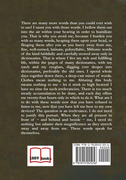 There are many more words than you could ever wish to use! I taunt you with those words. I bellow them out into the air within your hearing in order to humiliate you. That is why you avoid me, because I burden you with so many words, heaping them upon your head, or flinging them after you as you hurry away from me, fine, well-turned, latinate, polysyllabic, Miltonic words of the kind faithfully and carefully stowed away only in dictionaries. That is where I live my rich and fulfilling life, within the pages of many dictionaries, with my torch and my eyeglass, digging ever deeper into dictionaries, preferably the old ones. I spend whole days together down there, a deep-cast miner of words. Clothes mean nothing to me. Abluting this body means nothing to me - let it stink to high heaven! I have no time for such irrelevancies. There is too much steady accumulation to be done, and each day offers me twenty-four hours only in which to do it. What am I to do with these words now that you have refused to listen to me, now that you have left me here to my own devices? The question is an irrelevance. I do not need to justify this pursuit. When they are all present in front of ¿ and behind and beside ¿ me, I need do nothing but admire their magnificence as they stretch away and away from me. These words speak for themselves. Can you describe these seven hundred and ninety-four paragraphs as a collection of stories each of that length? Or are they more glimpses into the thoughts and feelings of other people: fleeting moments in complicated, or simple, lives? In modern jargon, might they be called prose poems?No two readers will interpret them the same, and probably not as the author envisaged - but isn't that the point? Doesn't fiction take on a life of its own once you set it free?It is perhaps a book more for dipping in and out of than one to read end-to-end, and depending on your mood, the weather, the day of the week, you will see something different, something new, and something outside of the story itself.
