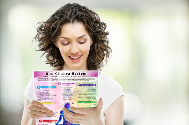 Das Chakra-System , präsentiert auf einer DINA4 Wissenskarte , macht die jahrtausendealte Weisheit der 7 Chakren zugänglich. Die Vorderseite zeigt Lage, Symbol, Funktion und Qualitäten jedes Chakras, während die Rückseite Anleitungen zur Chakra-Arbeit bietet.