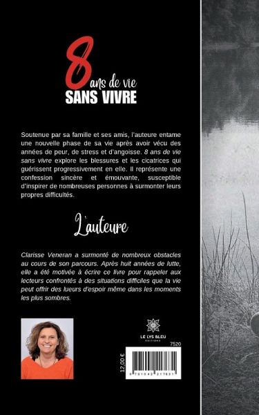 Soutenue par sa famille et ses amis, l¿auteure entame une nouvelle phase de sa vie après avoir vécu des années de peur, de stress et d¿angoisse. 8 ans de vie sans vivre explore les blessures et les cicatrices qui guérissent progressivement en elle. Il représente une confession sincère et émouvante, susceptible d¿inspirer de nombreuses personnes à surmonter leurs propres difficultés.