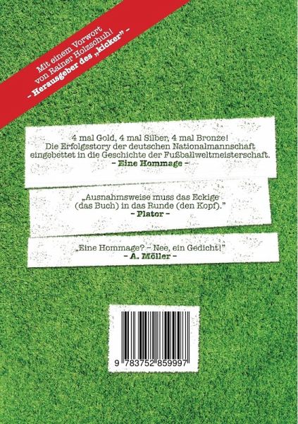 4 Mal Gold, 4 Mal Silber, 4 Mal Bronze! Die Erfolgsstory der deutschen Nationalmannschaft, eingebettet in die Geschichte der Fußballweltmeisterschaft. - Eine Hommage"Ausnahmsweise muss das Eckige (das Buch) in das Runde (den Kopf)." Plator"Eine Hommage? - Nee, ein Gedicht!" A. Möller