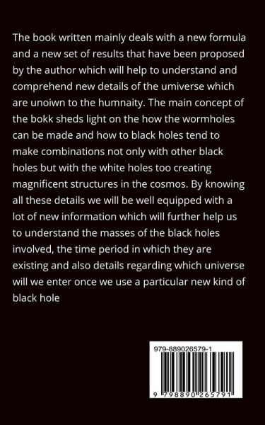 The book describes the main formula reagding the man made wormholes and 8 laws of black hole combination that has been proposed by the author which will help us to know a lot regarding the depths of the black holes