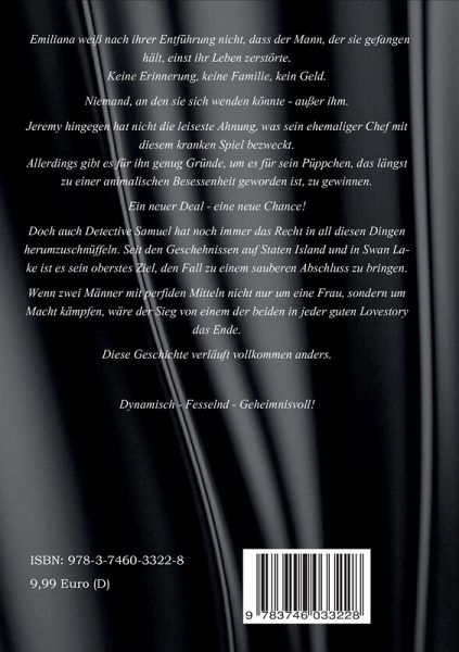 Emiliana weiß nach ihrer Entführung nicht, dass der Mann, der sie gefangen hält, einst ihr Leben zerstörte. Keine Erinnerung, keine Familie, kein Geld.Niemand, an den sie sich wenden könnte - außer ihm. Jeremy hingegen hat nicht die leiseste Ahnung, was sein ehemaliger Chef mit diesem kranken Spiel bezweckt. Allerdings gibt es für ihn genug Gründe, um es für sein Püppchen, das längst zu einer animalischen Besessenheit geworden ist, zu gewinnen. Ein neuer Deal - eine neue Chance! Doch auch Detective Samuel hat noch immer das Recht in all diesen Dingen herumzuschnüffeln. Seit den Geschehnissen auf Staten Island und in Swan Lake ist es sein oberstes Ziel, den Fall zu einem sauberen Abschluss zu bringen. Wenn zwei Männer mit perfiden Mitteln nicht nur um eine Frau, sondern um Macht kämpfen, wäre der Sieg von einem der beiden in jeder guten Lovestory das Ende. Diese Geschichte verläuft vollkommen anders. Dynamisch - Fesselnd - Geheimnisvoll!