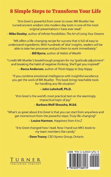 This groundbreaking and powerfully practical text offers a simple 8-step process for taking charge of our lives and achieving our dreams. It revolves around award-winning author MK Mueller¿s patented formula for positive living, positive relationships, and positive attitude. Written in Mueller¿s trademarked warm and wise voice, 8 to Great takes the reader from wherever they are in life and springboards them into a new level of healthy choices, increased wellbeing and loving relationships. Everyone says that positive attitude is vital for achieving greater happiness, health and success. Yet no one, until now, has given the world a formula simple enough to remember and use on a daily basis. One of Mueller¿s many gifts in this book is such a formula: FGHTM - Forgiveness of the past, Gratitude for the present, Hope for the future. Whether for yourself or someone you love, it is an investment that is sure to energize, enlighten and empower. Find out why thousands each year give her 8 High-Ways credit for empowering them to manifest their dreams and maintain a positive mindset no matter what!