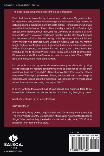 First of all, I come from a family of readers and educators. My grandmother on my father's side, with her white heritage and brilliant mind was allowed to get a high school education during the late 1800's. Her oldest son, who was my father inherited some of her brilliancy and graduated from Eureka High School, then Morehouse College, and the University of Wisconsin, all with honors. He was a voracious reader and scholar too. He also taught school and became a principal. He was my high school principal and administrator of my mother who attended Clark College in Atlanta, Georgia. My mother taught high school English in my high school where she introduced me to William Shakespeare, Longfellow, Rudyard Kipling and others. My father introduced me to Richard Wright, Frank Yerby, and a host of others like, Dickens, Alexander Dumas, Stevenson, to James Joyce, Mark Twain, W.E.B. Bois and many, many more great writers. I do not write to show my readers how extensive my vocabulary is by using words that keep my readers constantly running to dictionaries to seek their meanings. I use the "Kiss style" - Keep it simple Sam. For instance, others may write-"The inappropriateness of using the pocket knife to hew the giant hollyhock was indeed absurd or ludicrous." While I might say "It made about as much sense as a coon dog hunting rabbits.'' In all my writings there are things of significance and historical facts to be learned/read. I am an ex-school teacher who is still teaching through my books. Most of my stories have Happy Endings! Sam Wilson, Ill P.S. My wife, Ruby Jewel, acquired her love for reading while attending The Pine Woods Country Life School in Mississippi. As a "Cotton Blossom Singer" she read as they traveled across America. My book, "IT's Cotton Blossom Time" tells the true story.