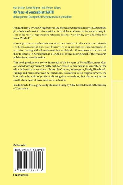 Founded in 1931 by Otto Neugebauer as the printed documentation service "Zentralblatt für Mathematik und ihre Grenzgebiete", Zentralblatt MATH (ZBMATH) celebrates its 80th anniversary in 2011. Today it is the most comprehensive and active reference database in pure and applied mathematics worldwide. Many prominent mathematicians have been involved in this service as reviewers or editors and have, like all mathematicians, left their footprints in ZBMATH, in a long list of entries describing all of their research publications in mathematics. This book provides one review from each of the 80 years of ZBMATH. Names like Courant, Kolmogorov, Hardy, Hirzebruch, Faltings and many others can be found here. In addition to the original reviews, the book offers the authors' profiles indicating their co-authors, their favorite journals and the time span of their publication activities. In addition to this, a generously illustrated essay by Silke Göbel describes the history of ZBMATH.