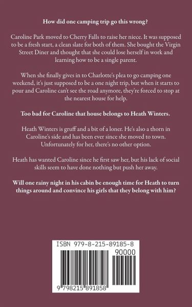 How did one camping trip go this wrong? Caroline Park moved to Cherry Falls to raise her niece. It was supposed to be a fresh start, a clean slate for both of them. She bought the Virgin Street Diner and thought that she could lose herself in work and learning how to be a single parent. When she finally gives in to Charlotte's plea to go camping one weekend, it's just supposed to be a one night trip, but when it starts to pour and Caroline can't see the road anymore, they're forced to stop at the nearest house for help. Too bad for Caroline that house belongs to Heath Winters. Heath Winters is gruff and a bit of a loner. He's also a thorn in Caroline's side and has been ever since she moved to town. Unfortunately for her, there's no other option. Heath has wanted Caroline since he first saw her, but his lack of social skills seem to have done nothing but push her away. Will one rainy night in his cabin be enough time for Heath to turn things around and convince his girls that they belong with him?
