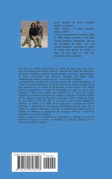 825 días de Vuelta al Mundo es el diario de viaje de una pareja sevillana de 35 años. Además de miles de anécdotas curiosas y divertidas, el lector encontrará una inmensa cantidad de datos sobre alojamientos, precios, transporte, etc, en los sitios visitados. Acompáñenos a bucear en la gran barrera de coral Australiana, a visitar un funeral Toraja en Indonesia, a sentir el calor de la lava de un volcán de Guatemala, a vivir Nueva York desde dentro, a viajar en barco para conocer el faro mas austral del planeta en la Tierra de Fuego Argentina, a visitar los templos de Angkor en Camboya, a sortear miles de motos en las calles de Ho Chi Min, a dormir a la orilla de un lago azul turquesa en Nueva Zelanda, a relajarnos en las playas paradisiacas de las Islas Fiji, a visitar un caracol zapatista en México, a rodearnos de tiburones nodriza en Belice... Viaje y conozca con nosotros la inmensidad y belleza de nuestro planeta, lo bueno y lo malo, lo divertido y lo trágico. Disfrute con la aventura de Pablo y Elena.