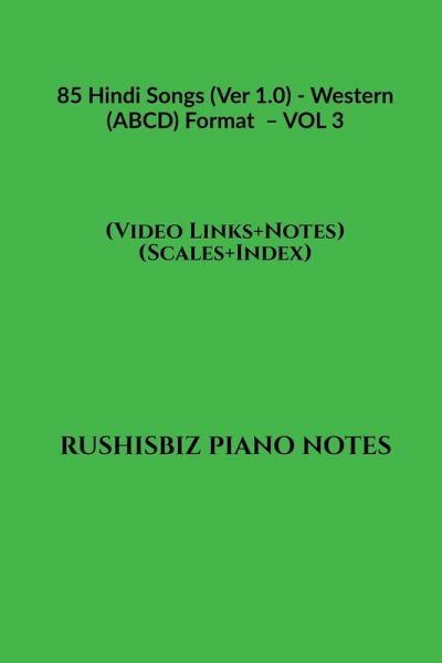 1)85 BEST HINDI SONGS FROM 1950 TO RECENT SONGS 2)ALL SONGS WILL BE IN ALPHABETICAL ORDER WITH FREE VIDEO TUTORIALS LINKS BELOW EACH SONG 3)EACH SONG IS MENTIONED WITH SCALE OR KEYS. 4)THE BOOK WILL HAVE INDEX WITH PAGE NUMBERS 5)ALL SONGS WILL BE IN WESTERN - (ABCD FORMAT) 6)CHEKC GALLERY FOR LIST OF SONGS & VIDEO TUTORIALS LINKS QR CODE