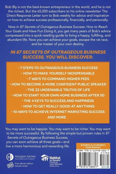 Based on copywriter Bob Bly's immensely popular online newsletter The Direct Response Letter, 87 Secrets of Outrageous Business Success compresses many years of Bob’s advice into a quick-reading guide to living a happy, fulfilling, and abundant life. Containing dozens of bite-sized chapters each sharing a single key to business and life success, this book will help you achieve your goals, escape the rat race, and be master of your own destiny.