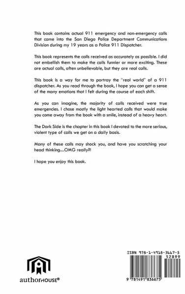 This book contains actual 911 emergency and non-emergency calls that came into the San Diego Police Department Communications Division during my 19 years as a Police 911 Dispatcher. This book represents the calls received as accurately as possible. I did not embellish them to make the calls funnier or more exciting. These are actual calls, often unbelievable, but they are real calls. This book is a way for me to portray the "real world" of a 911 dispatcher. As you read through the book, I hope you can get a sense of the many emotions that I felt during the course of my shift. The Dark Side is the chapter I devoted to the more serious, violent type of calls we get on a daily basis. I hope you enjoy the book.