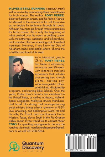 9 lives & Still Running is about A man's will to survive by overcoming three craniotomies for brain cancer. The Author, Tony Perez, believes that much tenacity and his Faith in Yeshua-Al Messiah is the essence of his will to survive as he depicts his testimony through this book. Although having to go through three craniotomies for brain cancer, this is only the beginning of what evolved over the years in battling cancer with chemotherapy, radiation, and full paralysis, not to mention; the overwhelming cost of medical treatment. However, if you know the God of Abraham, Isaac, and Jacob; Jehova- Shama, He is faithful and true to His seed. As a Messianic Jew in Christ, Tony Perez has been in missionary service for over 20 years, with extensive missions experience that includes pioneering new church plants, hosting city-wide evangelistic rallies, establishing discipleship programs, and starting Bible Schools. Over the years, Pastor Tony's ministry has ministered in the United States, as well as in Mexico, Holland, Spain, Singapore, Malaysia, Brunei, Honduras, and Israel. His strong and uncompromising pulpit ministry brings a fresh revelation of G-D's love, anointing, and Redemptive Word. He and his wife, Dr. Carol, and son Dominick live in Mission, Texas, down South in the Rio Grande Valley sector. If you would like to contact Pastor Tony for speaking engagements, he may be reached via email: mcallenhealingrooms@gmail.com or via cell 361-228-2064.