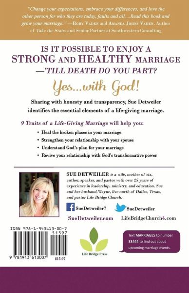 Is it possible to enjoy a strong and healthy marriage--'till death do you part? Yes... with God! Sharing with honesty and transparency, Sue Detweiler identifies the essential elements of a life-giving marriage. • Heal the broken places in your marriage • Strengthen your relationship with your spouse • Understand God's plan for your marriage • Revive your relationship with God's transformative power. Sue Detweiler is a wife, mother of six, author, and pastor with more than twenty-five years of experience in marriage, ministry, and education. She is also a popular speaker who shares her heart and wisdom internationally on issues related to marriage, family, women, prayer, leadership, and ministry. Sue Detweiler shares honestly and transparently in her book 9 Traits of a Life-Giving Marriage. With over 25 years of marriage and raising 6 children she knows how difficult developing a lasting relationship can be. She had a breakthrough in her marriage when she was face down before God and desperate for His help. She saw the brick wall of Criticism come down in her marriage and now has a ministry helping couples find safety and intimacy with each other. Communication: Heatly, Life-Giving Communication helps marriages grow strong. True honesty is tempored with the integrity of wisdom. Sue helps couples set ground rules to help couples watch their words, listen attentively, speak honestly, and keep a positive perspective. Intimacy is a hot topic for couples. Sue talks about the need for couples to build emotional, spiritual and physical intimacy with each other. She compassionately talks about struggles surrounding having a great sex life in christian marriages and overcome conterfeit intimacy and unhealthy behavior patterns Endurance is key to have a marriage that lasts. Sue encourages couples to take a stress test for their marriage. Every couple has the temptation to blame each other during times of stress, but Sue encourages embracing faith to fuel endurance needed for every lasting marriage. God has the ability to bring Restoration in marriages through the power of His redemptive love. Couples can keep their marriage from ending in the statistic of divorce. Revitalize expectancy in marriage. Forgiveness, restoration, and hope paves the way for fresh expectancy in marriage. Find more resources for Christian marriages at SueDetweiler.com