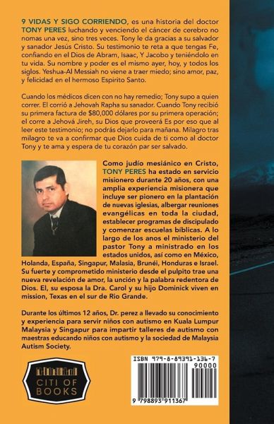9 vidas Y sigo corriendo, es una historia del doctor Tony Peres luchando y venciendo el cáncer de cerebro no nomas una vez, sino tres veces. Tony le da gracias a su salvador y sanador Jesús Cristo. Su testimonio te reta a que tengas Fe, confiando en el Dios de Abram, Isaac, Y Jacobo y teniéndolo en tu vida. Su nombre y poder es el mismo ayer, hoy, y todos los siglos. Yeshua-Al Messiah no viene a traer miedo; sino amor, paz, y felicidad en el hermoso Espirito Santo. Cuando los médicos dicen con no hay remedio; Tony supo a quien correr. El corrió a Jehovah Rapha su sanador. Cuando Tony recibió su primera factura de $80,000 dólares por su primera operación; el corre a Jehová Jireh, su Dios que proveerá Es por eso que al leer este testimonio; no podrás dejarlo para mañana. Milagro tras milagro te va a confirmar que Dios cuida de ti como al doctor Tony y te ama y espera de tu corazón par ser salvado.