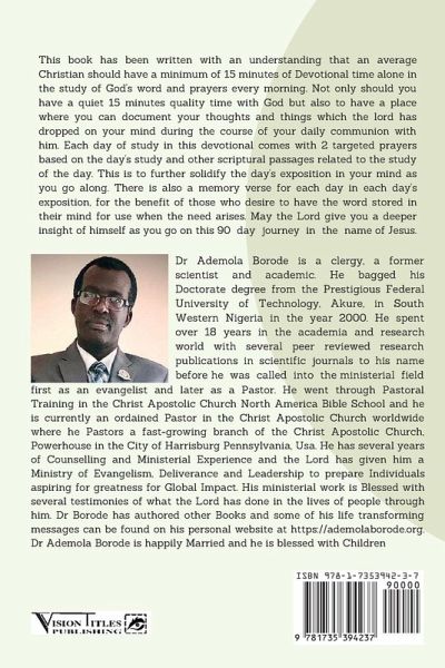 This book has been written with an understanding that an average Christian should have a minimum of 15 minutes of Devotional time alone in the study of God's word and prayers every morning. Not only should you have a quiet 15 minutes quality time with God but also to have a place where you can document your thoughts and things which the lord has dropped on your mind during the course of your daily communion with him. Each day of study in this devotional comes with 2 targeted prayers based on the day's study and other scriptural passages related to the study of the day. This is to further solidify the day's exposition in your mind as you go along. There is also a memory verse for each day in each day's exposition, for the benefit of those who desire to have the word stored in their mind for use when the need arises. May the Lord give you a deeper insight of himself as you go on this 90 day journey in the name of Jesus