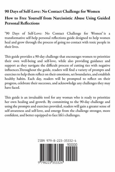 90 Days of Self-Love: No Contact Challenge for Women How to Free Yourself from Narcissistic Abuse Using Guided Personal Reflections "90 Days of Self-Love: No Contact Challenge for Women" is a transformative self-help personal reflections guide designed to help women heal and grow through the process of going no contact with toxic people in their lives. This guide provides a 90-day challenge that encourages women to prioritize their own well-being and self-love, while also providing guidance and support as they navigate the difficult process of cutting ties with negative influences.Throughout the guide, readers will find a variety of prompts and exercises to help them reflect on their emotions, set boundaries, and establish healthy habits. Each day, readers will be prompted to reflect on their progress, celebrate their successes, and acknowledge any challenges they may have faced. This guide is an invaluable tool for any woman who is ready to prioritize her own healing and growth. By committing to the 90-day challenge and using the prompts and exercises provided, readers will gain a greater sense of self-awareness and self-love, and emerge from the challenge stronger, more confident, and better equipped to face life's challenges. Disclaimer The information provided here is not intended to be a substitute for professional medical or therapeutic advice, diagnosis, or treatment. If you are experiencing significant emotional distress or require professional support, I strongly encourage you to seek the advice of a licensed mental health professional. The exercises and prompts in this guide are designed to promote self-reflection and self-awareness, but they may not be appropriate for everyone. Please consult a licensed mental health professional if you have any concerns or questions about your individual circumstances. By using this guide, you agree that you are solely responsible for your own emotional well-being and any actions you may take based on the content of this publication. The author and publisher are not liable for any damages or negative consequences that may arise from the use of this publication.