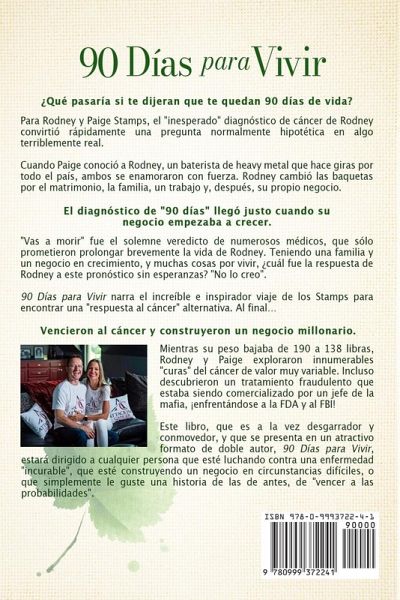 Una memoria inspiradora e inolvidable del impulso de una pareja por la supervivencia frente a probabilidades insuperables. Ganador del premio New York City Big Book American Book Fest - Ganador de los premios al mejor libro Ganador de los premios Wishing Shelf Book Awards Ganador del premio National Indie Excellence Award Ganador de los premios Beverly Hills Book Awards JACTARSE. Medallón Homenajeado Premio de Prensa Independiente - Favorito Distinguido Premio IAN Libro del Año - Finalista Cuando un diagnóstico inesperado de cáncer se convirtió rápidamente en una sentencia de muerte de 90 días de vida por parte de su médico, Rodney Stamps y su esposa Paige desafiaron al establecimiento médico y trazaron su línea en la arena. Con una familia y un negocio en crecimiento, y dado que sus médicos solo prometieron extender su vida brevemente con quimioterapia, los Stamps dieron un rotundo "No" a la quimioterapia y la radiación. 90 Days to Live relata el increíble e inspirador viaje de Stamps para encontrar una respuesta alternativa al cáncer. En el final ... Habían vencido al cáncer mientras construían un negocio de un millón de dólares. Siguiendo su protocolo TODO-natural religiosamente, el cáncer de Rodney entró en remisión completa. Además de ese triunfo, llevó su negocio de incendios y seguridad, que recién había comenzado a despegar cuando recibió su diagnóstico de cáncer, en una empresa de un millón de dólares. Alternativamente conmovedor y conmovedor, y presentado en un formato atractivo de doble autor, 90 Days to Live hablará con cualquiera que esté luchando con una enfermedad "incurable", que esté construyendo un negocio en circunstancias difíciles o con cualquier persona que simplemente ame a un buen pasado de moda. , historia de "superar las probabilidades".