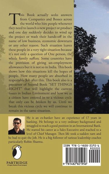 This Book actually seeks answers from Companies and Bosses across the world who hire people whenever they need to launch a new project or product and one day suddenly decides to windup the project or wash their hands-off in the name of low business, economic downturn or any other reasson. Such situation leaves these people in a very thight situation because it's not only a question of One person, the whole family suffers. Some countries have the provision of giving un-employment allowances but it is not so in India. This book shows how this situations kill the hopes of people. How many people are absorbed in respectable Job after this. This book also is a precusrsor of Second Book "SET THINGS RIGHT" that will highlight the current issues in Indain Enviroment and How we as a citizen have enterted in to a vicious cycle that only can be broken by us. Until we break this vicous cycle we will continue to remain in the same situation.