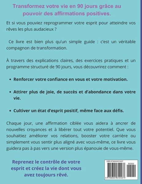 Transformez votre vie en seulement 90 jours grâce au pouvoir des affirmations positives ! Êtes-vous prêt(e) à libérer votre potentiel, à cultiver une pensée positive et à atteindre vos objectifs les plus ambitieux ? Ce livre est votre guide ultime pour reprogrammer votre esprit et transformer votre quotidien. À travers un programme structuré de 90 jours, découvrez comment les affirmations positives peuvent changer votre vie, une journée à la fois. Pourquoi ce livre est fait pour vous: * Simple et accessible: Pas besoin d'être un expert pour utiliser les affirmations. Ce livre vous accompagne pas à pas. * Puissant et transformateur: Chaque jour, une affirmation ciblée pour ancrer des croyances positives et dépasser vos limites. * Structuré 13 semaines thématiques pour couvrir tous les aspects de votre vie: confiance en soi, gratitude, motivation, vision à long terme, et bien plus. Ce que vous trouverez dans ce livre: * Des explications claires sur le fonctionnement des affirmations et leur impact sur votre subconscient. * Des exercices pratiques pour créer vos propres affirmations et les intégrer à votre routine. * Un programme quotidien de 90 jours avec des affirmations puissantes et des conseils concrets pour chaque semaine. * Des outils pour évaluer vos progrès et rester motivé(e) tout au long de votre transformation. Quelques exemples d'affirmations que vous découvrirez: * Je crois en ma capacité à réussir. * Chaque jour, je deviens la meilleure version de moi-même. * Je mérite de vivre une vie joyeuse et épanouissante. * Je prends des mesures concrètes pour réaliser mes rêves. Les bienfaits que vous en tirerez: En suivant ce programme, vous apprendrez à * Renforcer votre confiance en vous et votre estime personnelle. * Attirer davantage de joie, d'abondance et de succès dans votre vie. * Gérer vos pensées et émotions pour cultiver un état d'esprit positif et résilient. * Développer une vision claire et inspirante de votre avenir. Pour qui est ce livre ? Que vous soyez novice en développement personnel ou déjà engagé(e) sur le chemin de la transformation, ce livre est conçu pour s'adapter à vos besoins. Il s'adresse à toutes les personnes qui souhaitent: * Créer une vie alignée avec leurs aspirations. * Surmonter les pensées limitantes et les doutes. * Adopter des habitudes positives et durables. Un voyage transformateur vous attend... Ne laissez plus vos pensées négatives saboter votre potentiel. Reprenez le contrôle de votre esprit et commencez dès aujourd'hui votre transformation en 90 jours. Chaque page de ce livre est conçue pour vous inspirer, vous motiver et vous guider vers une vie plus épanouie.