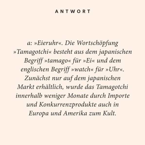Die quietschige Ära mit Baggy Pants, Schulterpolstern, Crop Tops und Ugly Sneakers ist wieder da: Willkommen in der Zukunft, liebe 90er! Über die Mode hinaus fasziniert das Jahrzehnt von Discman und Diddl, Buffalos und Britney, GameBoy und Ghettoblaster noch heute. Welches sprechende Spielzeug eroberte damals jedes Kinderzimmer? Was war die "Samtene Scheidung"? Und wessen erster deutscher Nummer-1-Hit war "Quit Playing Games (with My Heart)"?Stilvoll, elegant und immer eine gute Idee: Die Reihe "Quiz im Quadrat" präsentiert sich in modernem Design und sorgt für unterhaltsamen Rätselspaß - verpackt in einer edlen Geschenkbox. Perfekt als besondere 'Grußkarte' mit Mehrwert - zum Verschenken oder Selberfreuen!