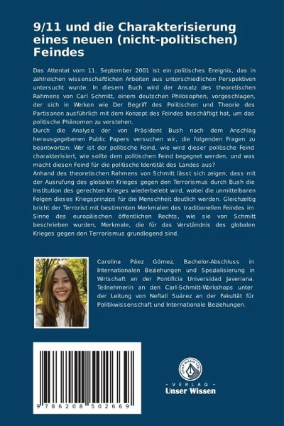 Das Attentat vom 11. September 2001 ist ein politisches Ereignis, das in zahlreichen wissenschaftlichen Arbeiten aus unterschiedlichen Perspektiven untersucht wurde. In diesem Buch wird der Ansatz des theoretischen Rahmens von Carl Schmitt, einem deutschen Philosophen, vorgeschlagen, der sich in Werken wie Der Begriff des Politischen und Theorie des Partisanen ausführlich mit dem Konzept des Feindes beschäftigt hat, um das politische Phänomen zu verstehen.Durch die Analyse der von Präsident Bush nach dem Anschlag herausgegebenen Public Papers versuchen wir, die folgenden Fragen zu beantworten: Wer ist der politische Feind, wie wird dieser politische Feind charakterisiert, wie sollte dem politischen Feind begegnet werden, und was macht diesen Feind für die politische Identität des Landes aus?Anhand des theoretischen Rahmens von Schmitt lässt sich zeigen, dass mit der Ausrufung des globalen Krieges gegen den Terrorismus durch Bush die Institution des gerechten Krieges wiederbelebt wird, wobei die unmittelbaren Folgen dieses Kriegsprinzips für die Menschheit deutlich werden. Gleichzeitig bricht der Terrorist mit bestimmten Merkmalen des traditionellen Feindes im Sinne des europäischen öffentlichen Rechts, wie sie von Schmitt beschrieben wurden, Merkmale, die für das Verständnis des globalen Krieges gegen den Terrorismus grundlegend sind.