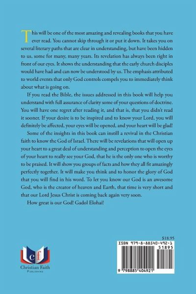 This will be one of the most amazing and revealing books that you have ever read. You cannot skip through it or put it down. It takes you on several literary paths that are clear in understanding, but have been hidden to us, some for many, many years. Its revelation has always been right in front of our eyes. It shows the understanding that the early church disciples would have had and can now be understood by us. The emphasis attributed to world events that only God controls compels you to immediately think about what is going on. If you read the Bible, the issues addressed in this book will help you understand with full assurance of clarity some of your questions of doctrine. You will have one regret after reading it, and that is, that you didn't read it sooner. If your desire is to be inspired and to know your Lord, you will definitely be affected, your eyes will be opened, and your heart will be glad! Some of the insights in this book can instill a revival in the Christian faith to know the God of Israel. There will be revelations that will open up your heart to a great deal of understanding and perception to open the eyes of your heart to really see your God, that he is the only one who is worthy to be praised. It will show you groups of facts and how they all fit amazingly perfectly together. It will make you think and to honor the glory of God that you will find in his word. To let you know our God is an awesome God, who is the creator of heaven and Earth, that time is very short and that our Lord Jesus Christ is coming back again very soon. How great is our God! Gadol Elohai!